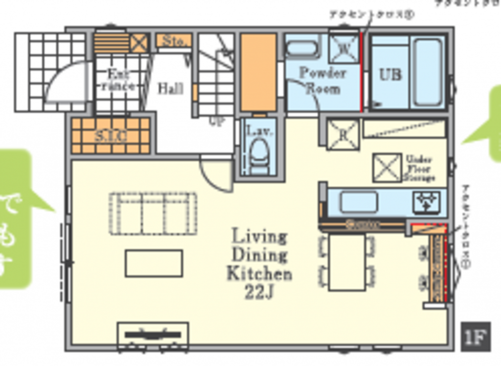 - システムキッチン、カウンターキッチン、浴室乾燥機、モニタ付インターホン、洗浄便座、床下収納、トイレ2箇所、床下収納/浄水器