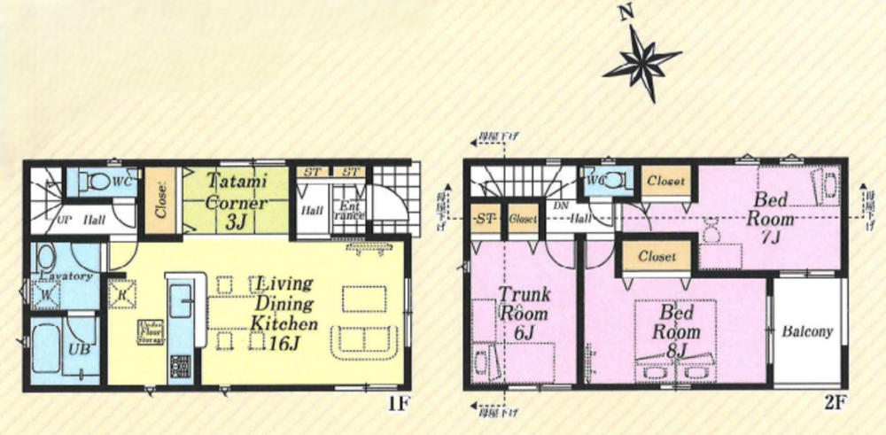 - ルーフバルコニー、システムキッチン、カウンターキッチン、浴室乾燥機、モニタ付インターホン、複層ガラス、追い焚き、駐車場2台分、床下収納